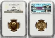 В таблице показаны цены на царскую монету 10 рублей 1910 года (ЭБ) выполненной из золота. Продажи фиксируются на публичных нумизматических аукционах всего мира. Стоимость продажи указана без учета комиссионного вознаграждения аукциона.