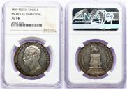 В таблице показаны цены на царскую монету 1 рубль 1859 года "В память открытия монумента Императору Николаю I на коне" выполненной из серебра. Выпуклый чекан. Продажи фиксируются на публичных нумизматических аукционах всего мира. Стоимость продажи указана без учета комиссионного вознаграждения аукциона.