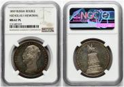 В таблице показаны цены на царскую монету 1 рубль 1859 года "В память открытия монумента Императору Николаю I на коне" выполненной из серебра. Обычный чекан. Продажи фиксируются на публичных нумизматических аукционах всего мира. Стоимость продажи указана без учета комиссионного вознаграждения аукциона.