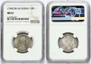 В таблице показаны цены на царскую монету Полуполтинник 1794 года СПБ-АК выполненной из серебра. Продажи фиксируются на публичных нумизматических аукционах всего мира. Стоимость продажи указана без учета комиссионного вознаграждения аукциона.