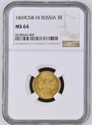Согласно аукционным продажам, средняя цена данной монеты на 12 декабря 2025 составляет - 340000 рублей для регулярного чекана. Самый дорогой экземпляр, выставлялся 17 августа 2024 года в Далласе на американском аукционе Heritage Auction Galleries, лот номер 34834. На торгах стоимость достигла 10200 долларов США. Для золотых 3 рублей 1869 года с буквами СПБ НІ - это является самой высокой ценой на сегодняшний день.
