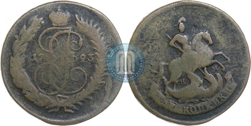2 копейки 1793 года ЕМ "Павловский перечекан". "ЕМ" под конем. Медь. Гурт сетчатый. Биткин # P107 (R), Петров - 6 руб., Ильин - 3 руб.