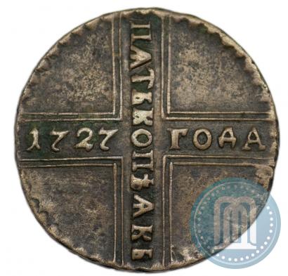 5 копеек 1727 года КД . "ПЯТЬ КОПЪAКЬ". Одна из точек над короной. Медь. Гурт сетчатый.