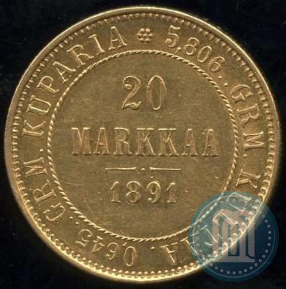 20 марок 1891 года L . Золото. Гурт рубчатый. Биткин # 227 (R), Конрос # 481/4