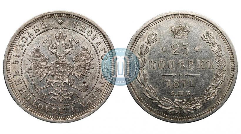 25 копеек 1871 года СПБ-НІ . Серебро. Гурт пунктир. Биткин # 147 (R), Петров - 1,5 руб., Конрос # 138/24