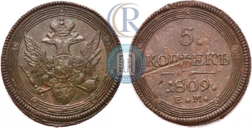 5 kopecks 1809 year ЕМ . Large crown. Copper. Edge cordlike leftwards. Bitkin # 298 (R4), Petrov - нет rub., Ilyin - нет rub., Conros # 182/14