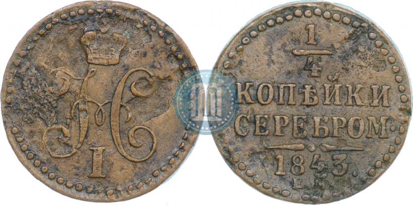 1/4 kopeck 1843 year ЕМ . Copper. Edge plain. Conros # 241/11