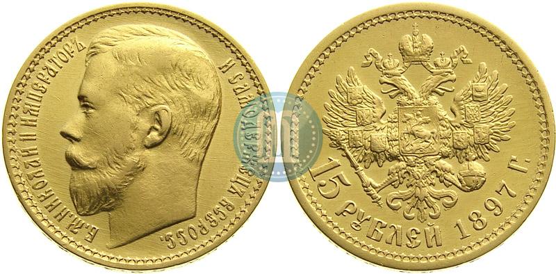 15 roubles 1897 year (АГ) . Three last letters are above the edge of the neck. Gold. Edge inscription. Petrov - нет rub., Ilyin - нет rub., Conros # 1/2 1/3