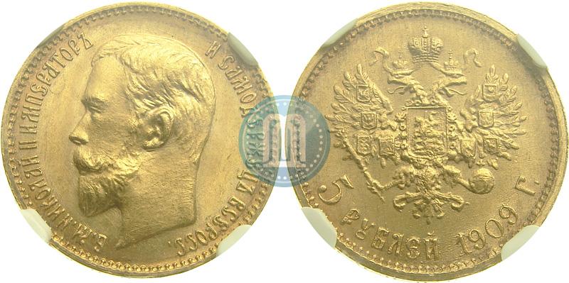 5 roubles 1909 year (ЭБ) . Gold. Edge patterned. Bitkin # 34 (R), Conros # 20/17